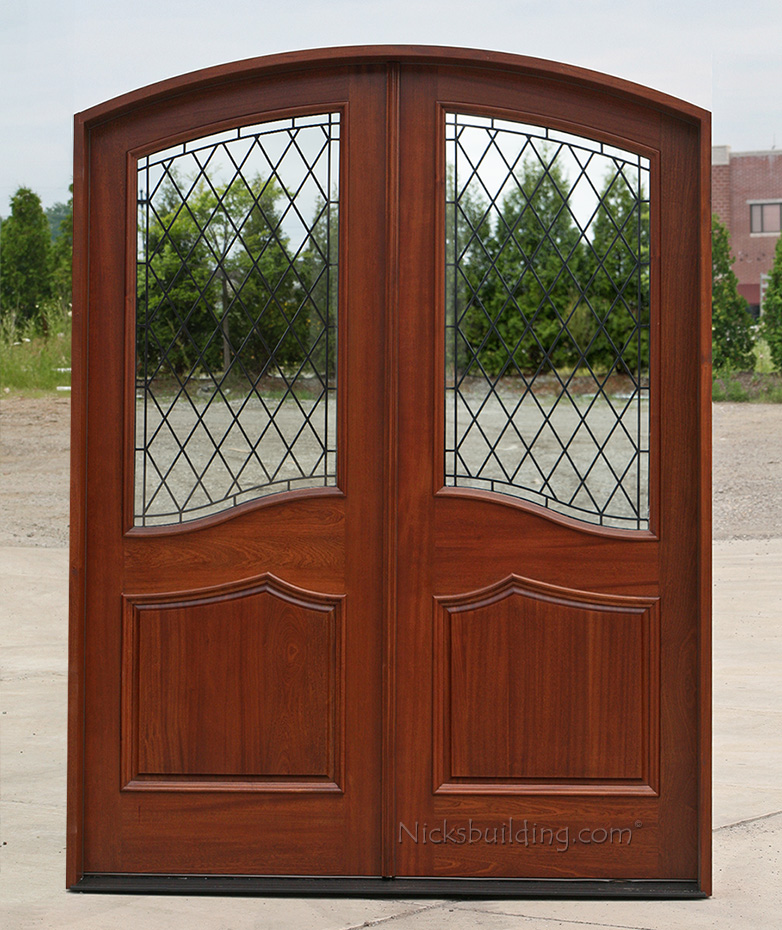 Custom Mahogany Arched Top Double Doors have Arched Glass and Panels